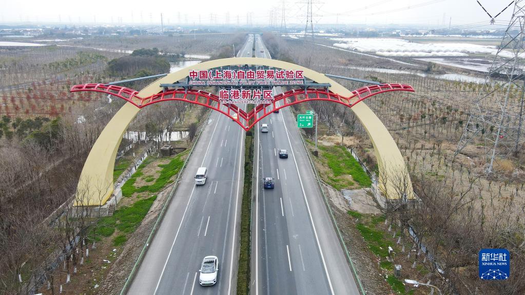 这是2022年2月10日拍摄的S2沪芦高速上的中国(上海)自由贸易试验区临港新片区“海鸥门”(无人机照片)。新华社记者 方喆 摄
