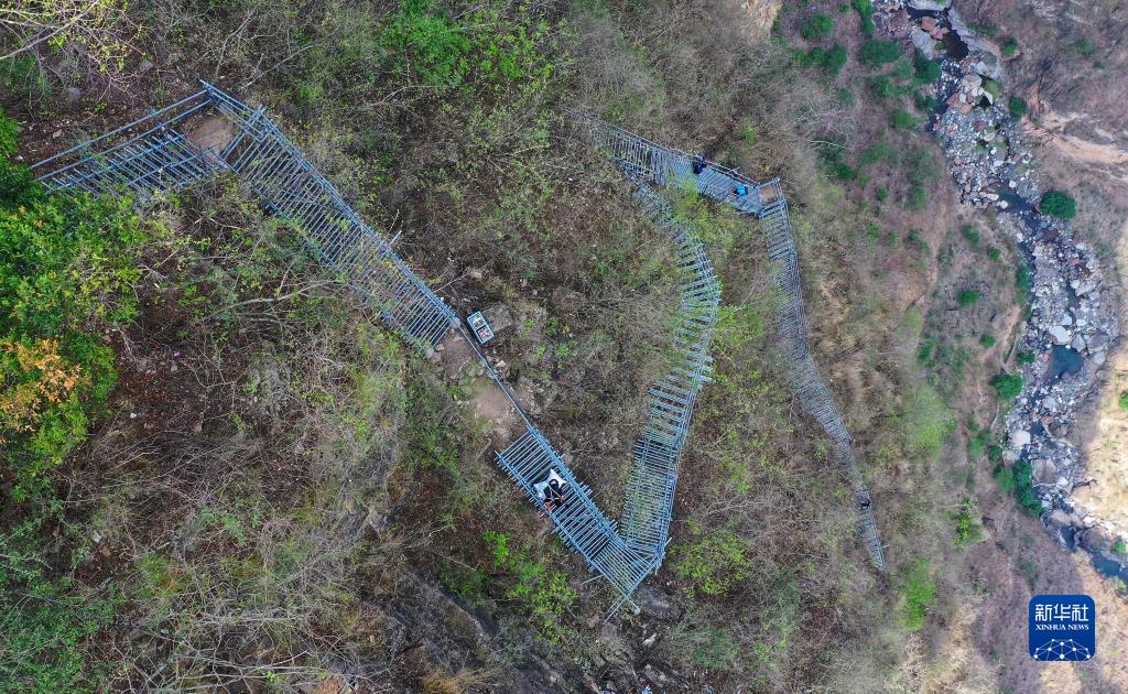 在四川凉山彝族自治州昭觉县阿土列尔村的悬崖钢梯上,“悬崖村”村民沿着钢梯下山(2020年5月13日摄,无人机照片)。新华社记者 王曦 摄