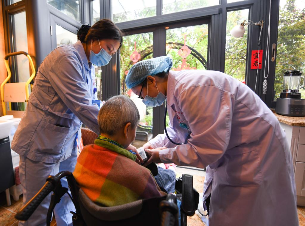 5月18日,在成都市温江区万春镇天乡路社区居民家中,家庭医生杨静(右)和护士黄佳妮(左)为居民叶茂群检查身体。新华社记者王曦 摄